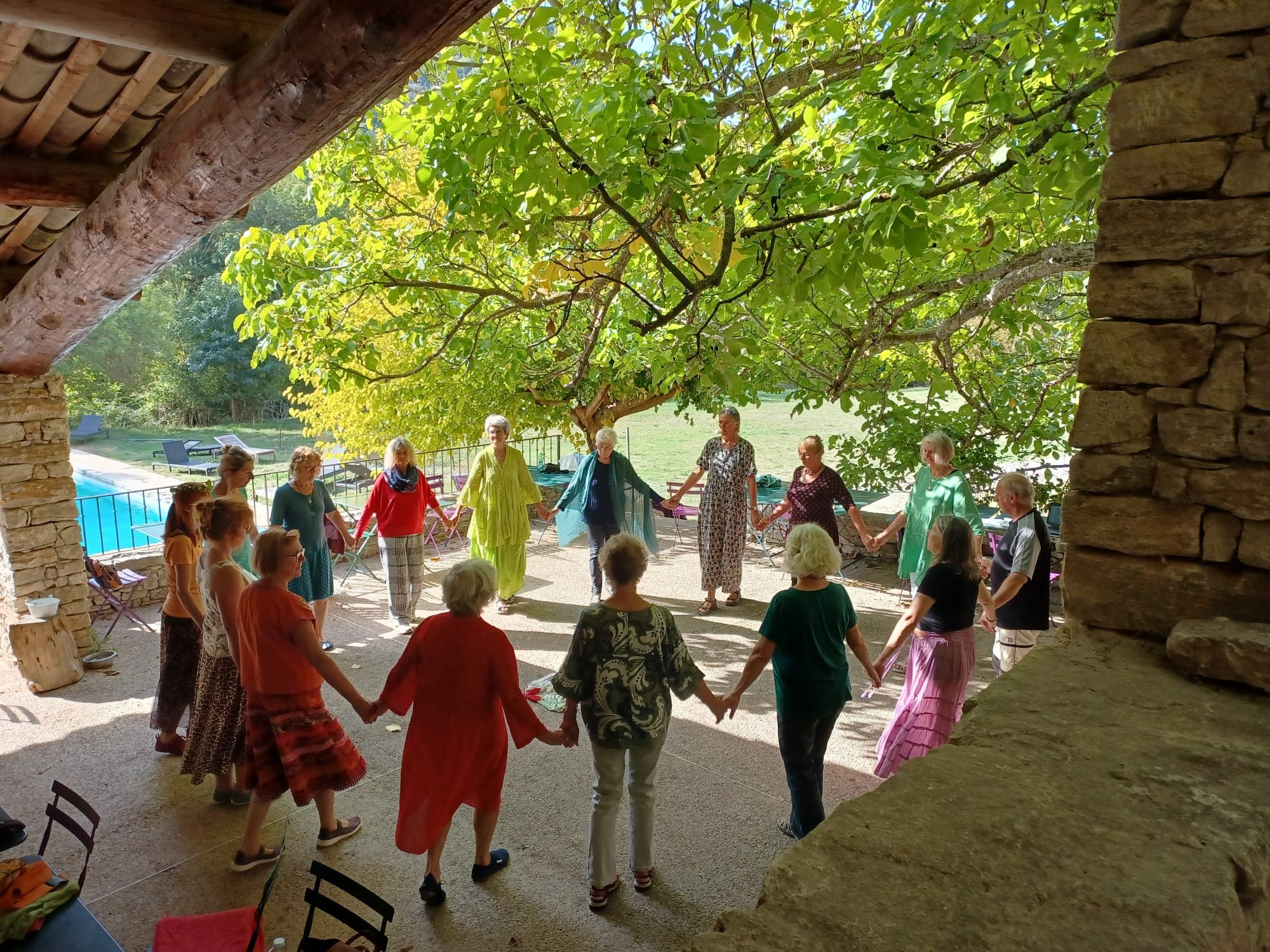 Auf der schönsten Tanzterrasse, die ich kenne, mit spektakulärer Aussicht verbinden wir uns im Tanzkreis und mit Mutter Erde. Ich gebe Tänze von Laura Shannon und Kyriakos Moisidis mit großer Freude weiter. Es fließen auch Tänze und Lieder ein von Gila Antara, Mandy de Winter und Arunga Heiden.